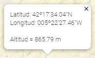 Esta herramienta calcula la altitud en un punto. Se puede acceder a esta funcionalidad seleccionando el icono Haciendo clic directamente sobre un punto en el visor se selecciona la ubicación en la cual se desea conocer la cota altimétrica del modelo digital del terreno. La información correspondiente al punto seleccionado se muestra en un marcador informativo.